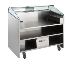 Postazione di cottura a vista con sistema di aspirazione per 3 elementi .Dedicato agli specialisti dello showcooking. Il pratico banco su ruote, dotato