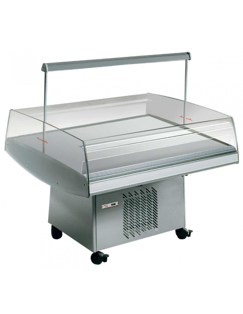 Piano espositivo refrigerato ad isola con vetro perimetrale panoramico per self-service, ventilato +2°/+4°C